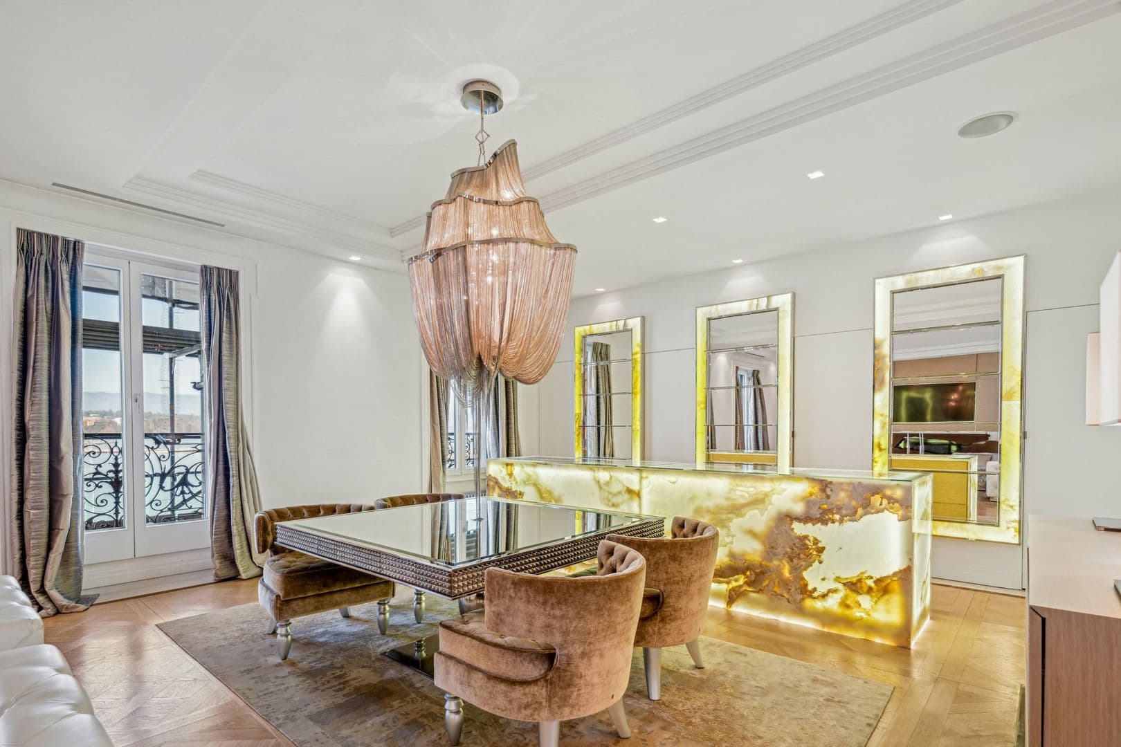 D’une surface PPE de 189 m², ce bien rare se compose d’un spacieux séjour/salle à manger de plus de 60 m², baigné de lumière grâce à ses larges ouvertures donnant sur un balcon avec vue directe sur le lac. L’espace de vie intègre une cheminée à l'éthanol, ainsi qu’un téléviseur encastré, sublimant le design intérieur conçu sur mesure par un architecte intérieur. La cuisine ouverte, équipée d’un îlot central, propose un électroménager haut de gamme totalement intégré.