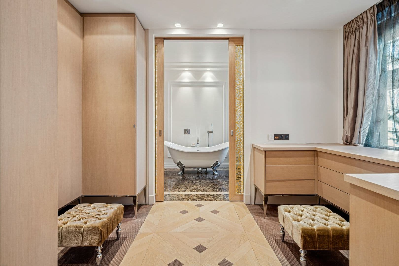 Côté nuit, l’appartement dispose de deux chambres élégantes, chacune agrémentée de sa propre salle de bains et de son dressing, dont l’une bénéficie d’un accès direct à un second balcon. Une toilette visiteurs ainsi qu’une buanderie privative avec rangement viennent compléter. Bien qu’aucune place de parc ne soit attribuée à l’appartement, des possibilités d’achat ou de location sont envisageables à proximité immédiate.