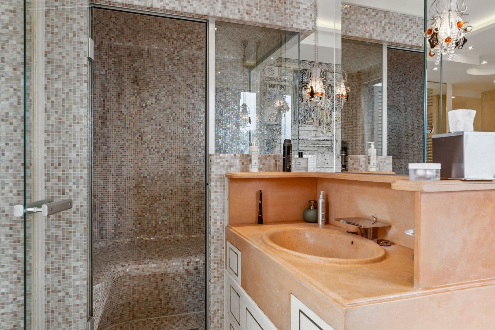 La maîtresse de maison souhaitait une très grande salle de bain avec hammam et là aussi Richard Ferbach a joué avec les volumes, les tons, les matières, pour obtenir le résultat souhaité. Deux tableaux de mosaïques évoquent le bain. Ils sont spectaculaires et vivants. C'est que les pièces de ont été taillées une à une, à la main, pour suivre le dessin demandé et non des carreaux industriels alignés les uns à coté des autres. Incroyable !