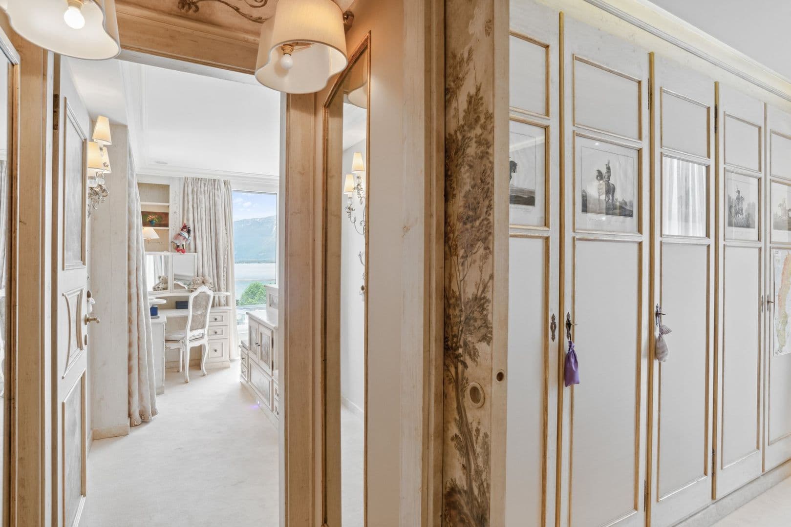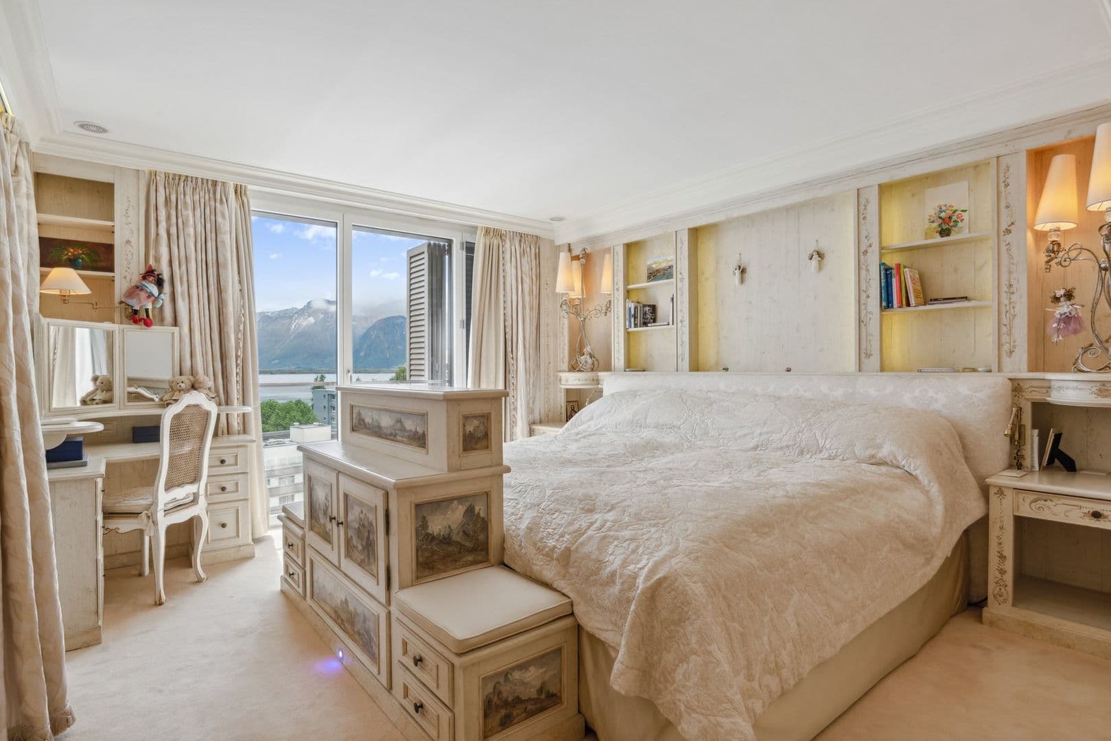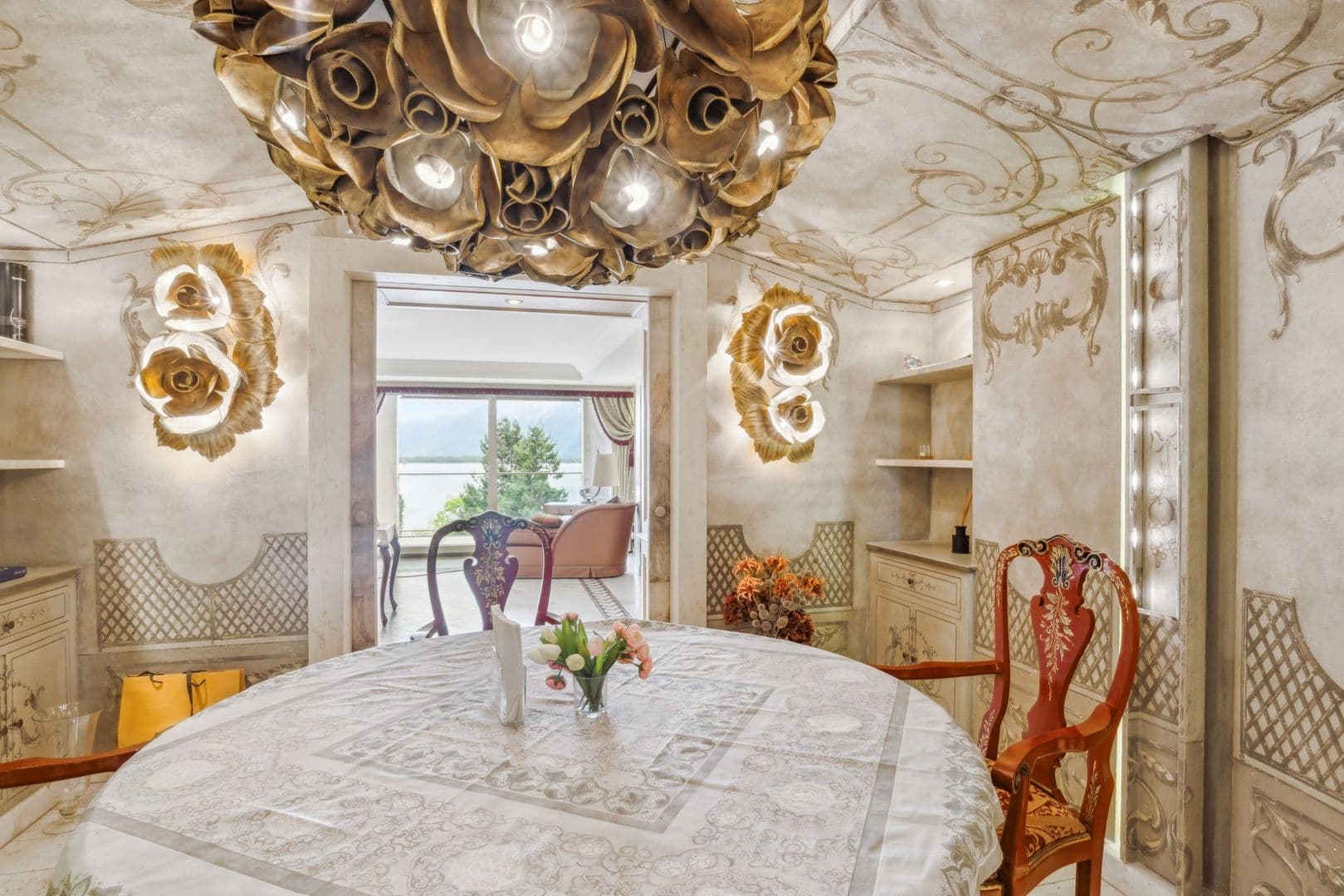 L'appartement totalise une surface pondérée d'environ 219 m² et offre un intérieur atypique et unique, disposant de grands espaces de vie. Il bénéficie d'un spacieux séjour de 53 m² s'ouvrant sur un balcon de 20 m² qui jouit d'une vue plongeante sur le lac Léman et les montagnes environnantes.