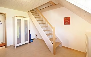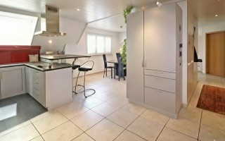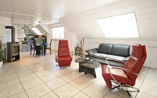 Depuis l’entrée de l’appartement, un escalier escamotable mène à un grenier faisant office d’espace de rangement supplémentaire, complété par une cave et par une pièce de stockage située au-dessus du garage privé, plus un carport à disposition. Pour un usage commun, la maison propose une grande salle polyvalente/fête avec kitchenette et un espace privatif ( 4 propriétaires) de bien-être avec sauna, douche et WC, ainsi qu’un charmant jardin commun avec pelouse soignée, beaux arbres, biotope et coin barbecue/pique-nique.