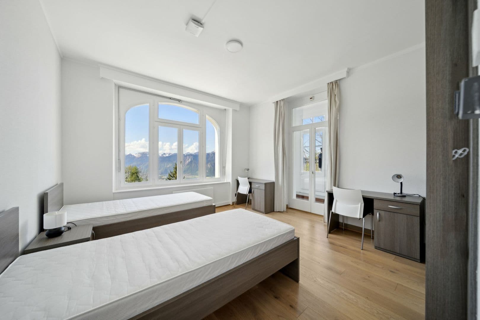 Environnement calme et verdoyant avec une vue à couper le souffle sur le lac et les montagnes.