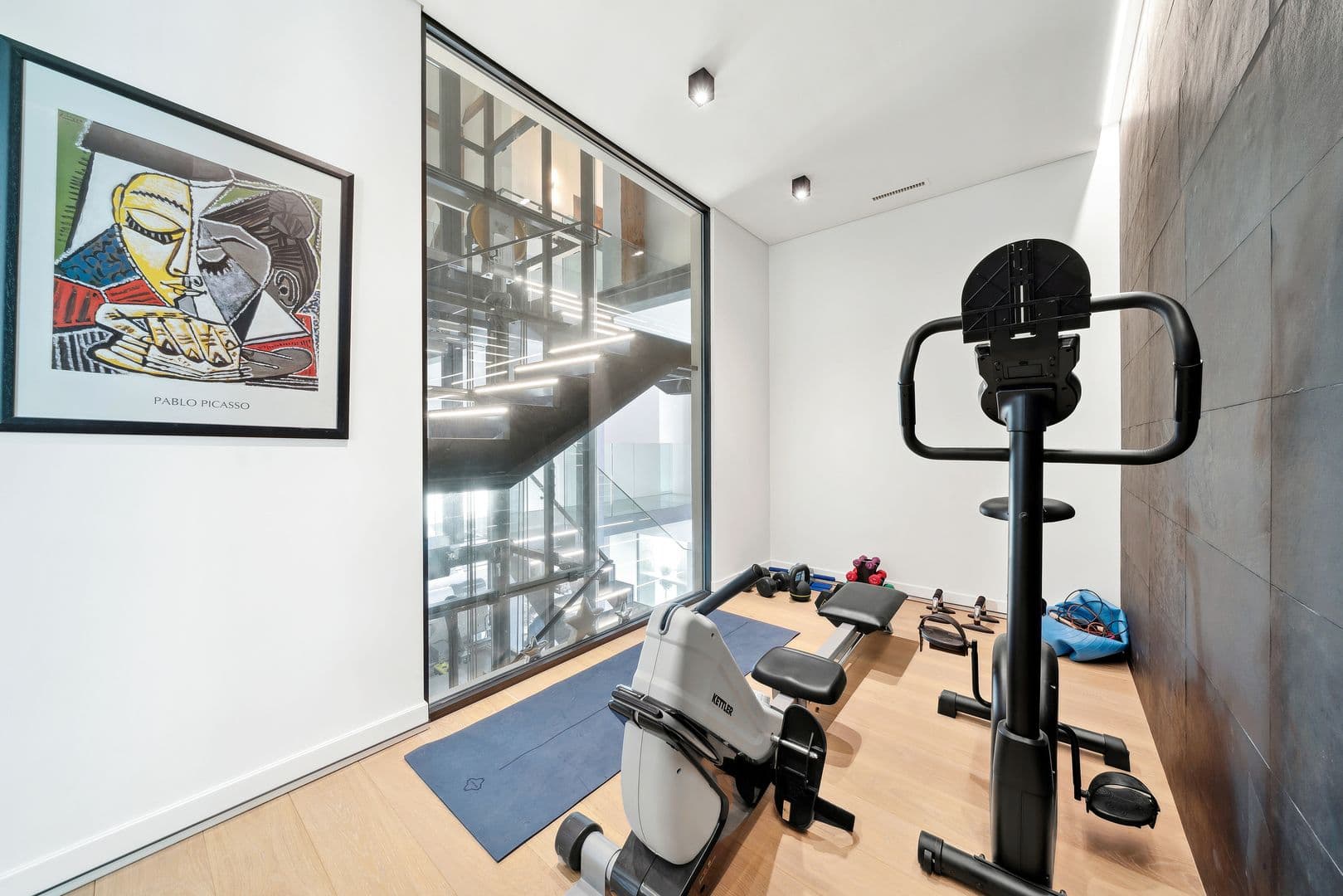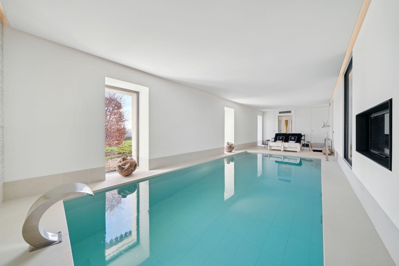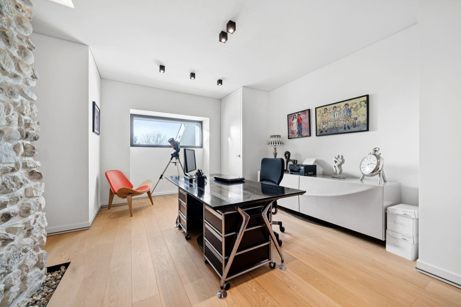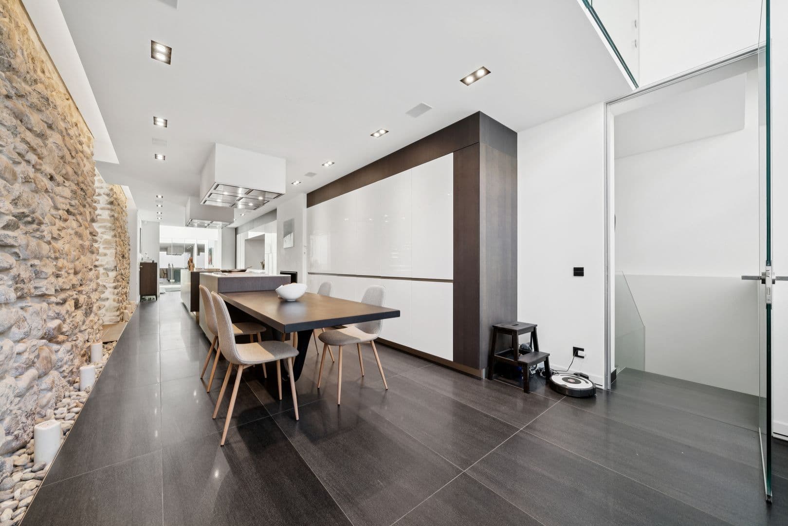 De vastes volumes baignés de lumière, des parquets en chêne fumé, de grandes baies vitrées et des puits de lumière, des coursives en verre, des matériaux nobles et un mur en pierre d’origine confèrent à la maison une identité unique. Le confort est renforcé par une domotique complète (éclairage, chauffage, sécurité, Sonos). Le rez-de-chaussée accueille une spectaculaire pièce de vie à double hauteur, deux cheminées modernes, ainsi qu’une cuisine indépendante parfaitement équipée avec deux fours, deux lave-vaisselle, deux îlots, une plaque teppanyaki, un puissant système d’extraction et un monte-plats discret reliant la cuisine au premier étage, idéal pour servir les invités dans la salle de cinéma ou la recreation room.