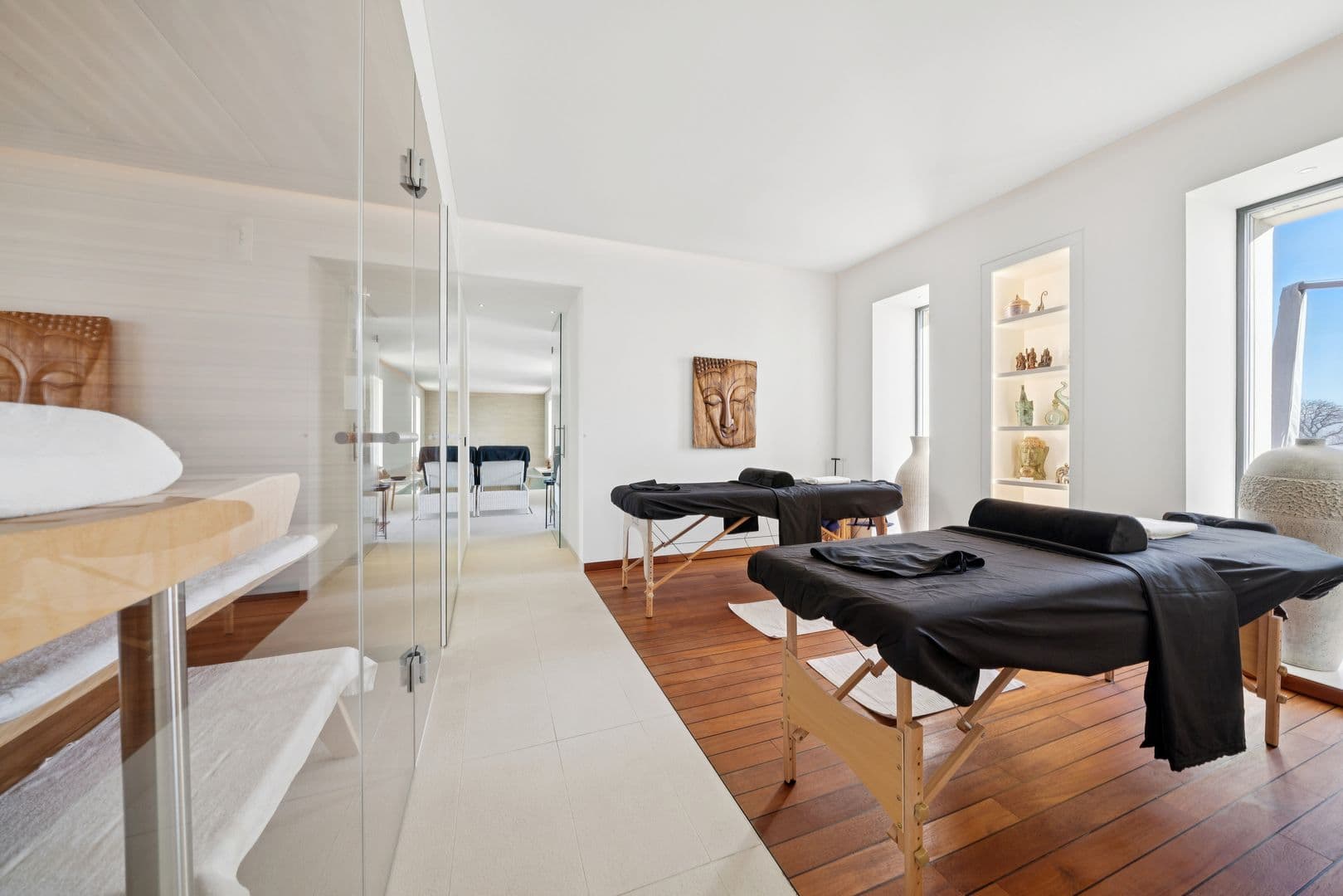 Un spa intérieur complète le niveau principal, comprenant une piscine de 7 × 3,5 m avec swim jet, un sauna et des douches design, le tout s’ouvrant sur une terrasse intime dotée de parasols encastrés, d’un foyer extérieur et de deux fontaines décoratives.