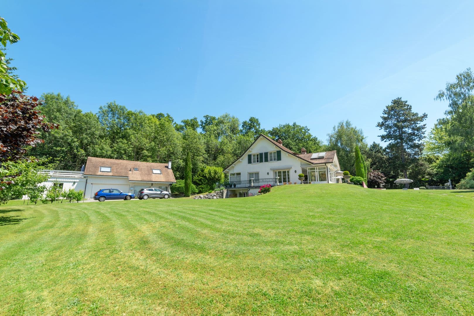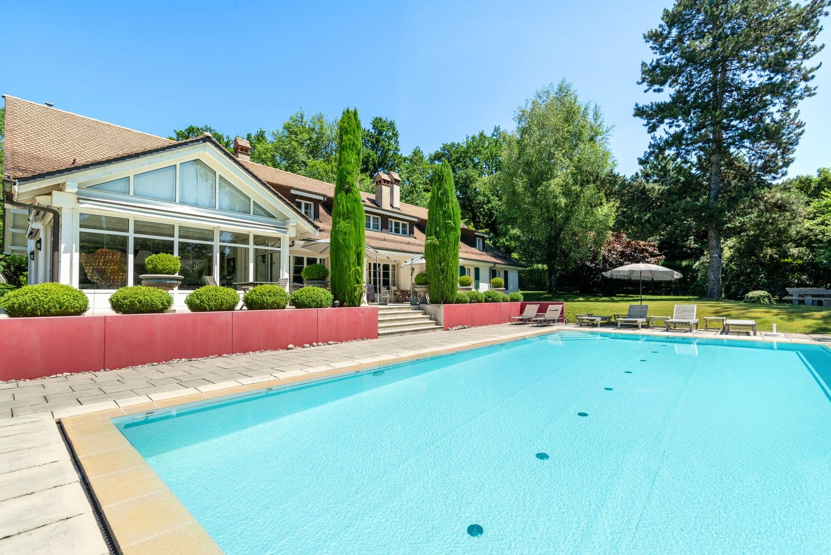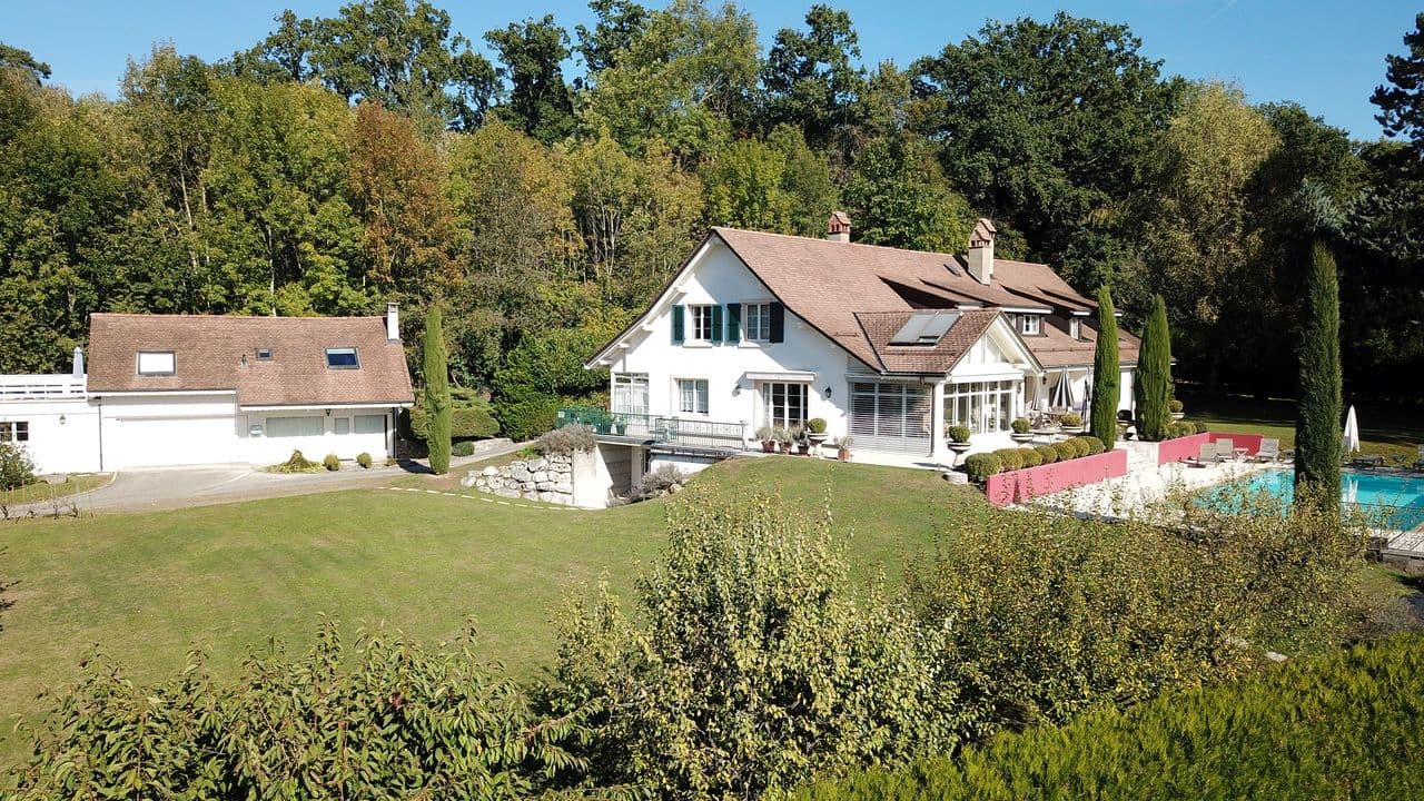 Le jardin paysager d’une surface d’environ 4'000 m2 abrite nombreuses essences d’arbres et arbustes. Une magnifique piscine à débordement et une plage permet de profiter pleinement de cet endroit privilégié.