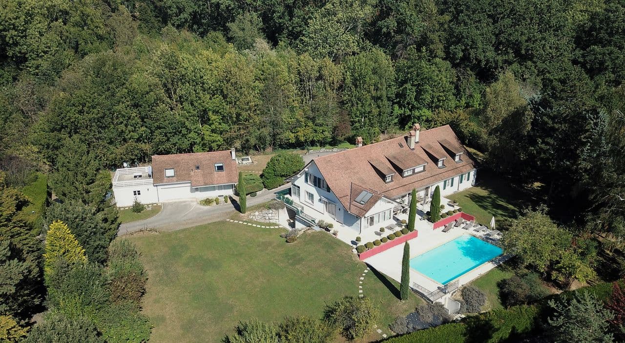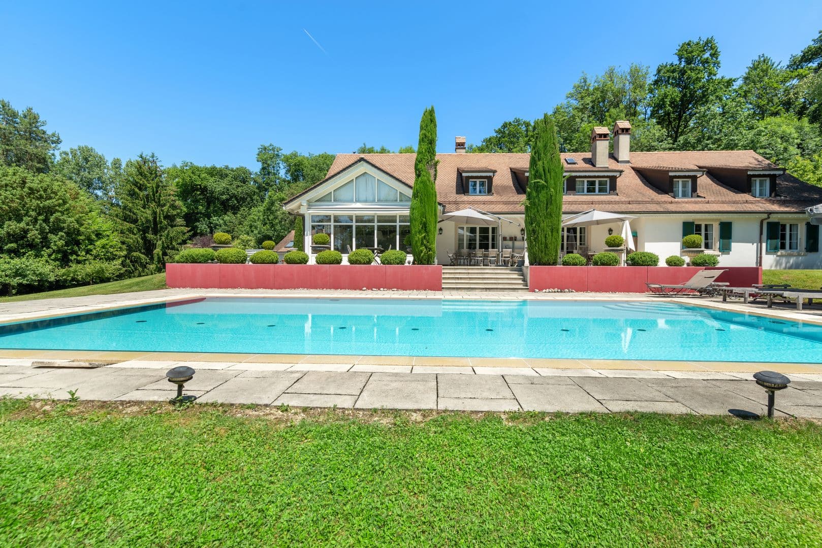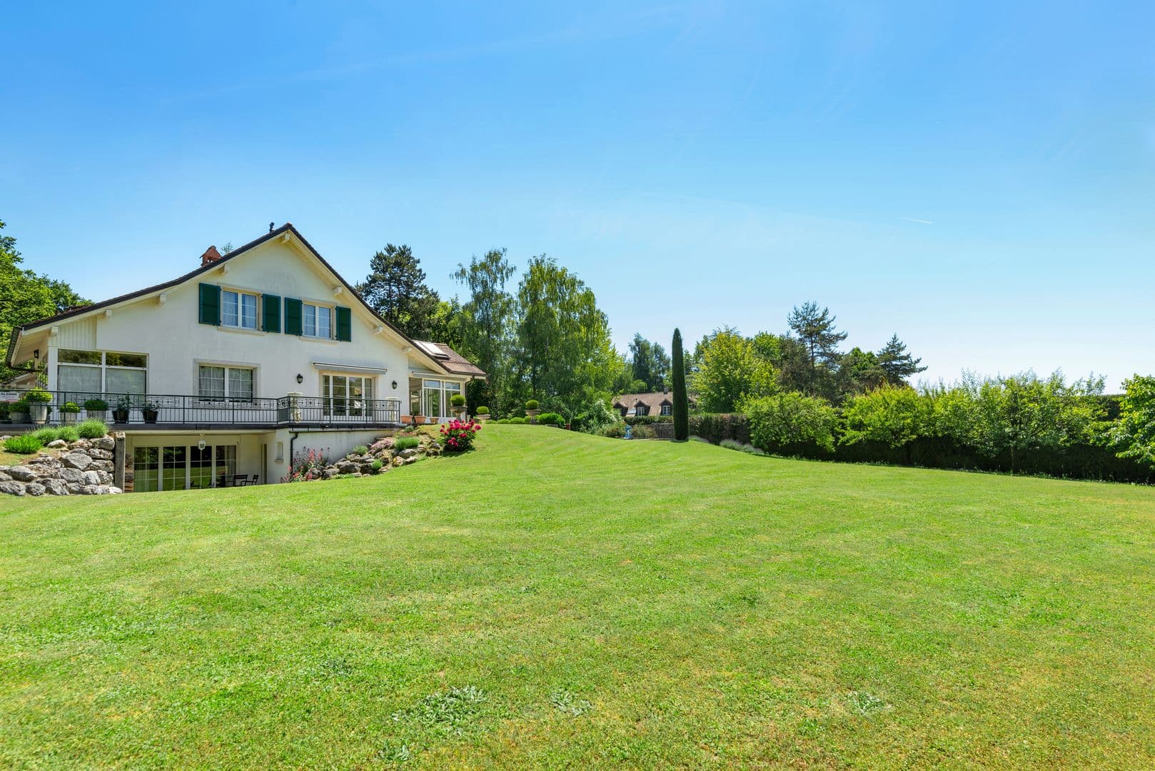 Le jardin paysager d’une surface d’environ 4'000 m2 abrite nombreuses essences d’arbres et arbustes. Une magnifique piscine à débordement et une plage permet de profiter pleinement de cet endroit privilégié.