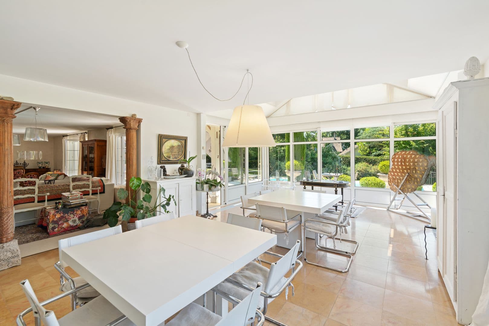 Le rez de chaussée offre de vastes pièces de réception s’ouvrant sur une belle terrasse en pierre et un jardin paysager. La salle à manger permet d’accueillir des grandes tablées dans une atmosphère conviviale. Une grande suite parentale occupe l’aile gauche et abrite l’ascenseur qui dessert les trois niveaux.