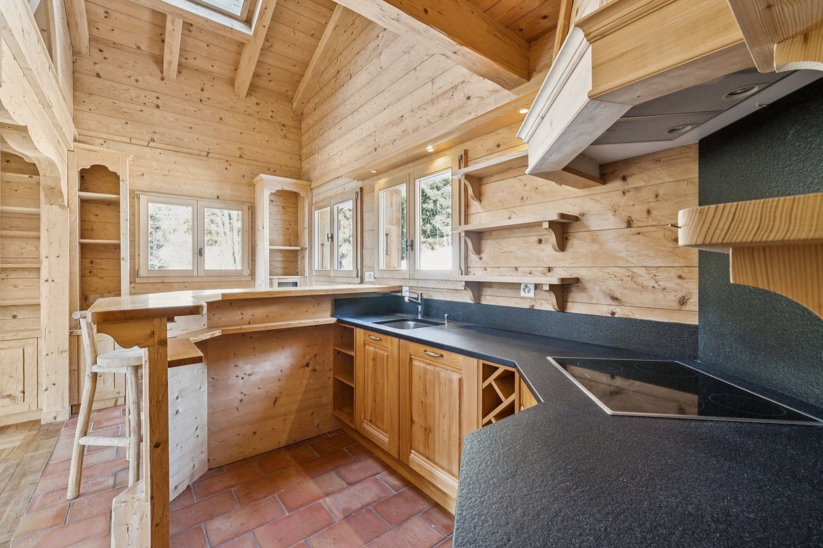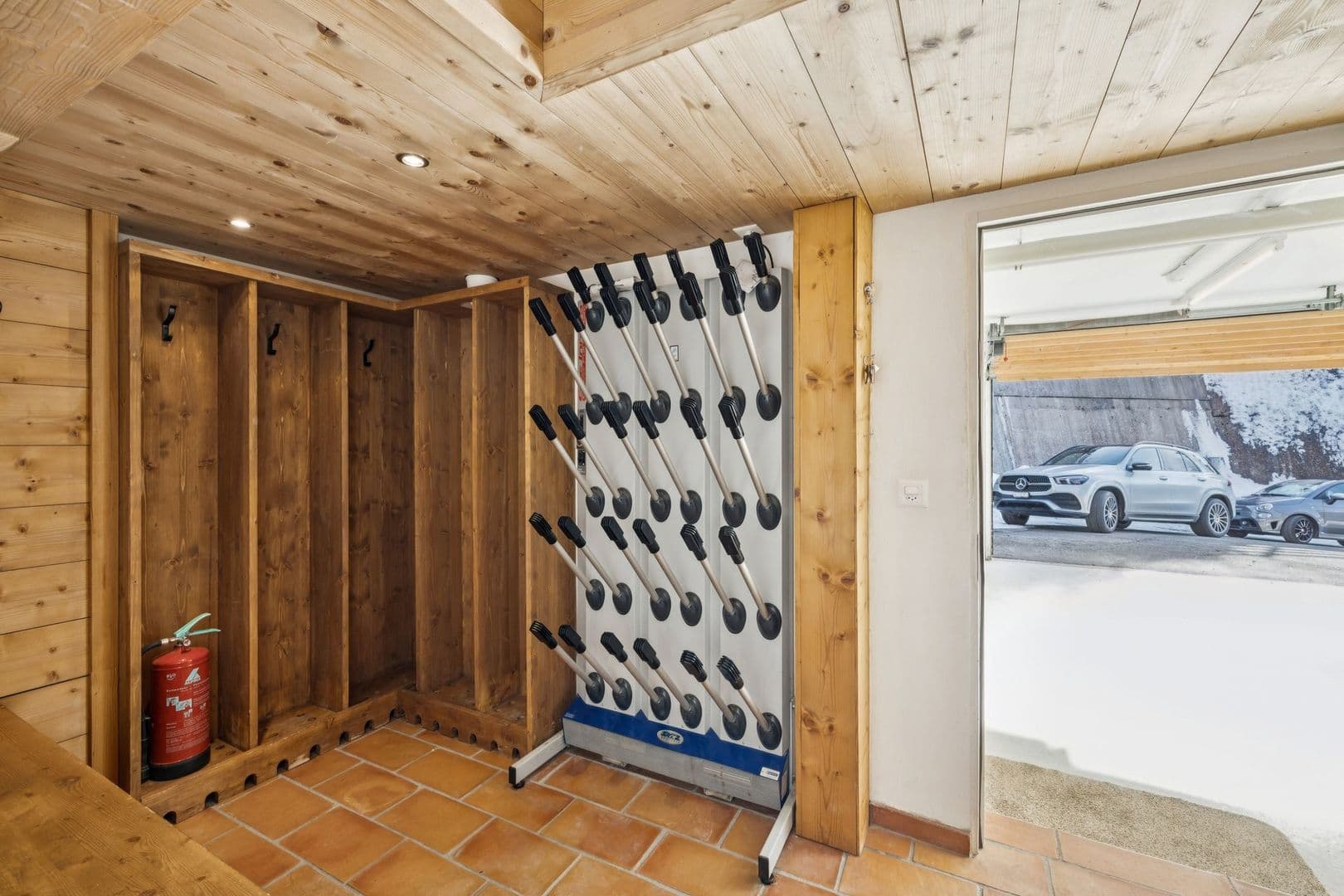La propriété comprend cinq chambres spacieuses, quatre salles de bains, deux cuisines entièrement équipées, un double garage intérieur avec porte automatique, un vestiaire et ski-room, ainsi qu’un abri atomique, offrant à la fois confort, praticité et sécurité.