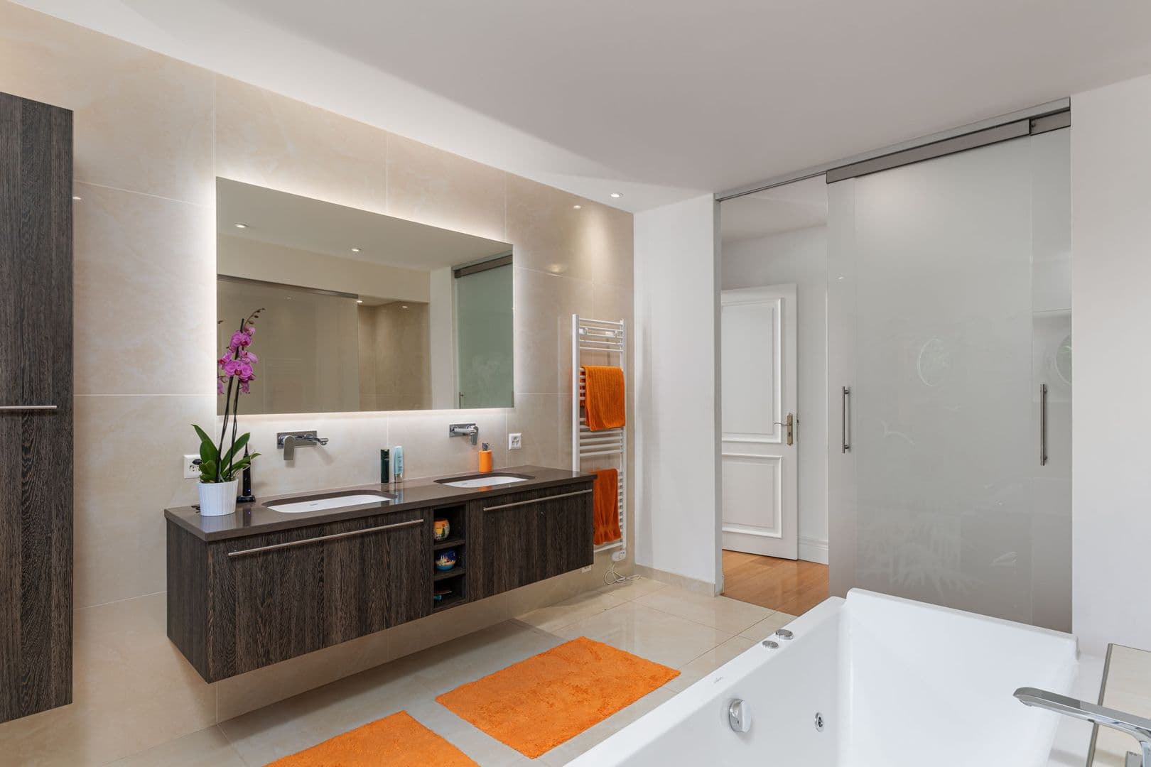 Au1er étage, vous bénéficierez de deux chambres à coucher en suite avec chacune leur salle de bains et dressing ainsi que d’une spacieuse pièce idéale pour y faire une troisième chambre à coucher, une salle de jeux ou un bureau.