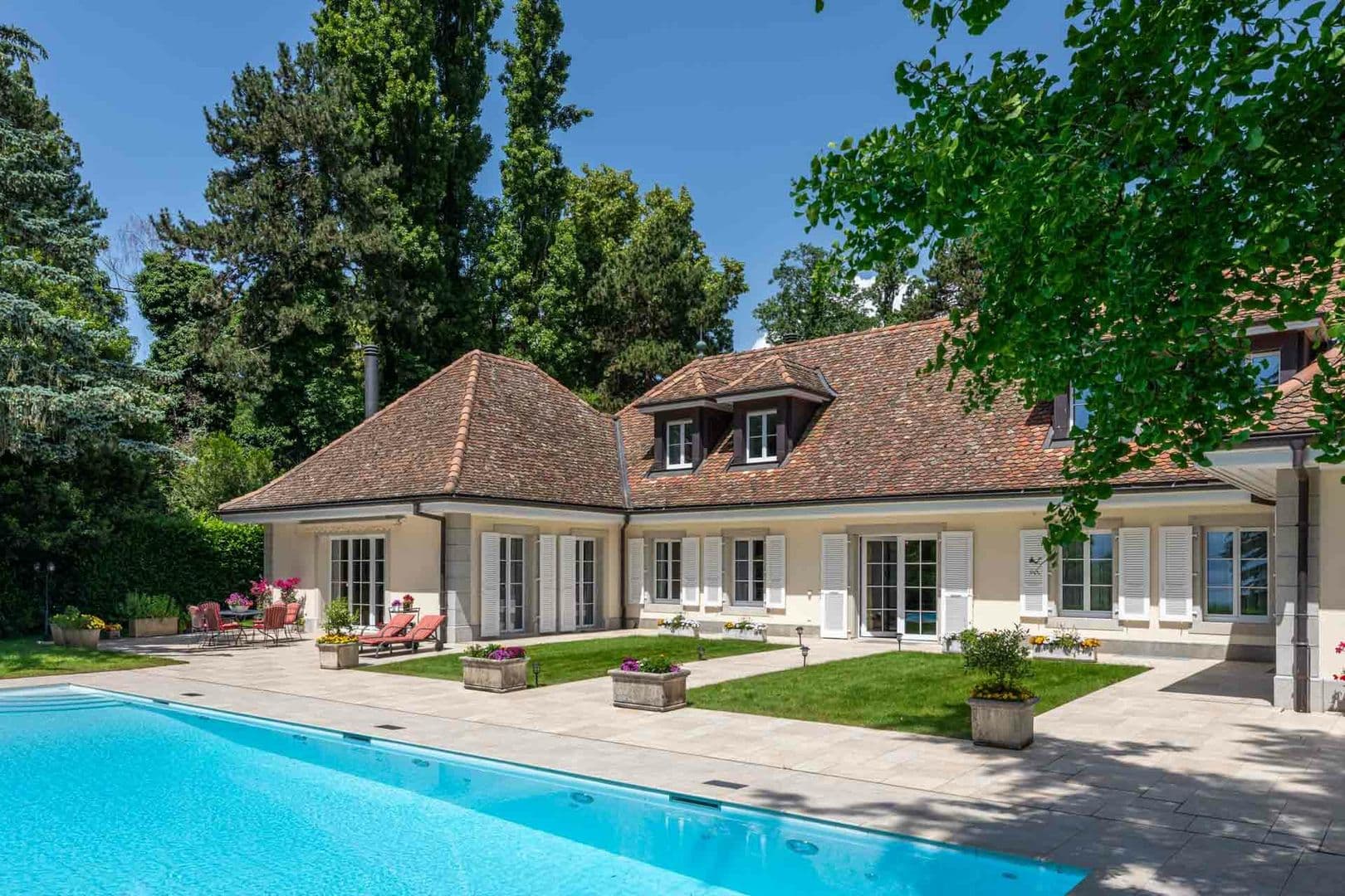 À l’extérieur, un jardin abrite une variété d’essences d’arbres et de fleurs créant un cadre paisible et harmonieux, à l'abri des regards. Une terrasse surplombant le lac offre un espace idéal pour se détendre et profiter de la vue spectaculaire. Une magnifique piscine chauffée vient sublimer cet extérieur.