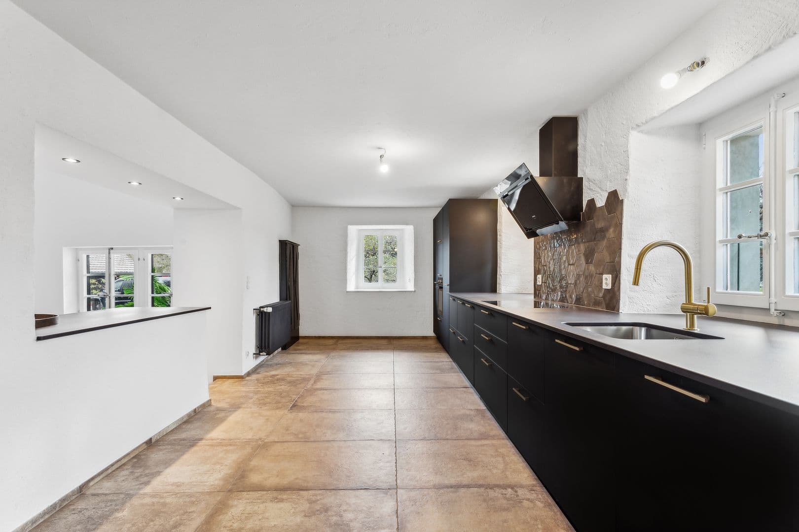 Les rénovations réalisées ont su préserver le caractère authentique de la ferme, avec des matériaux de standing et un design soigné. Les grands espaces ouverts, les hautes plafonds et les fenêtres généreuses créent une ambiance lumineuse et spacieuse.