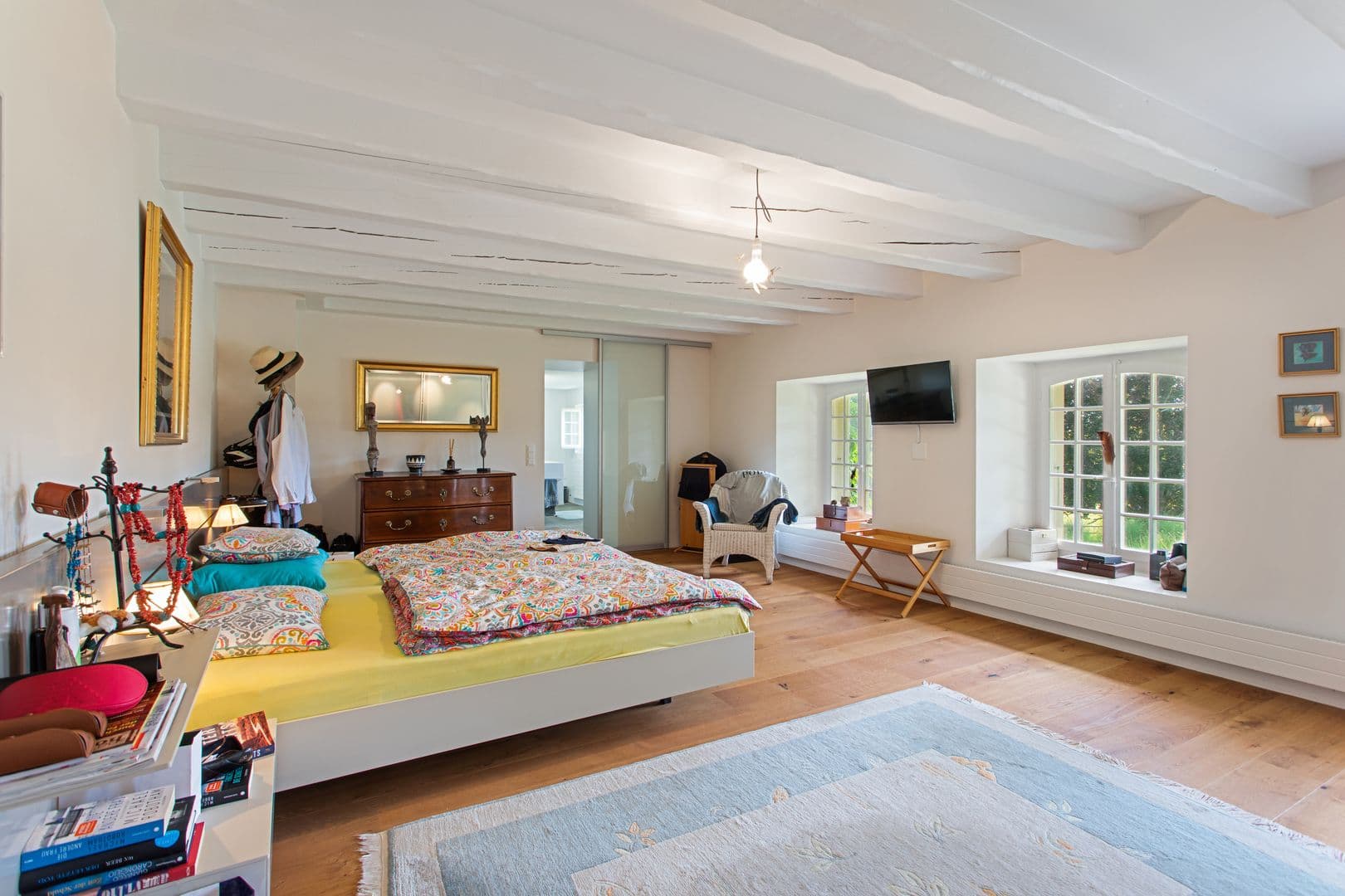 Le charme de l’ancien a été conservé, en passant par les cheminées en pierre, les poêles en faïences, les belles poutres apparentes et les fenêtres habillées d’élégantes grilles.