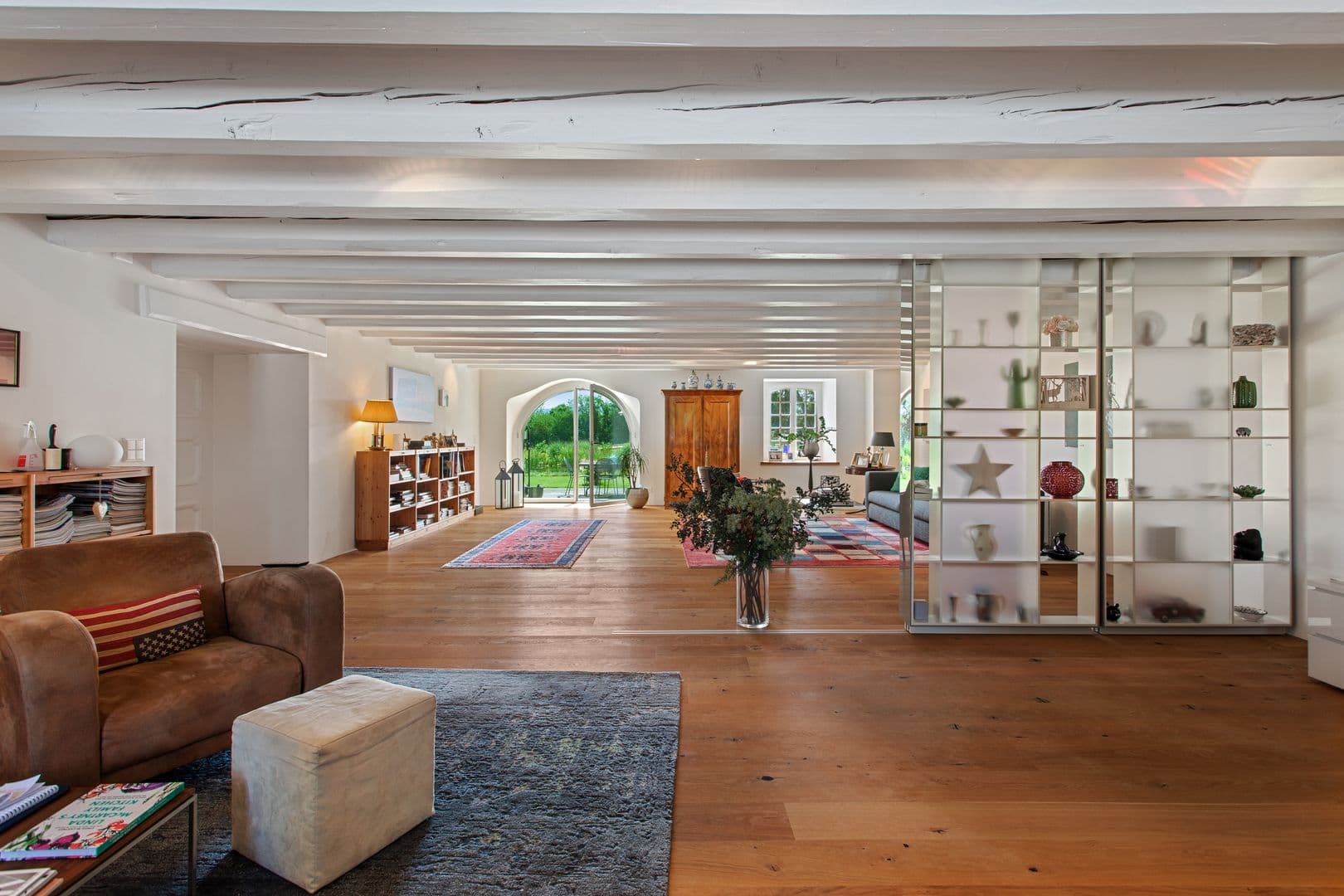 La belle galerie à l'étage dispose d'une vue plongeante sur l'imposante pièce à vivre qui est baignée de lumière grâce à la vaste hauteur sous plafond.