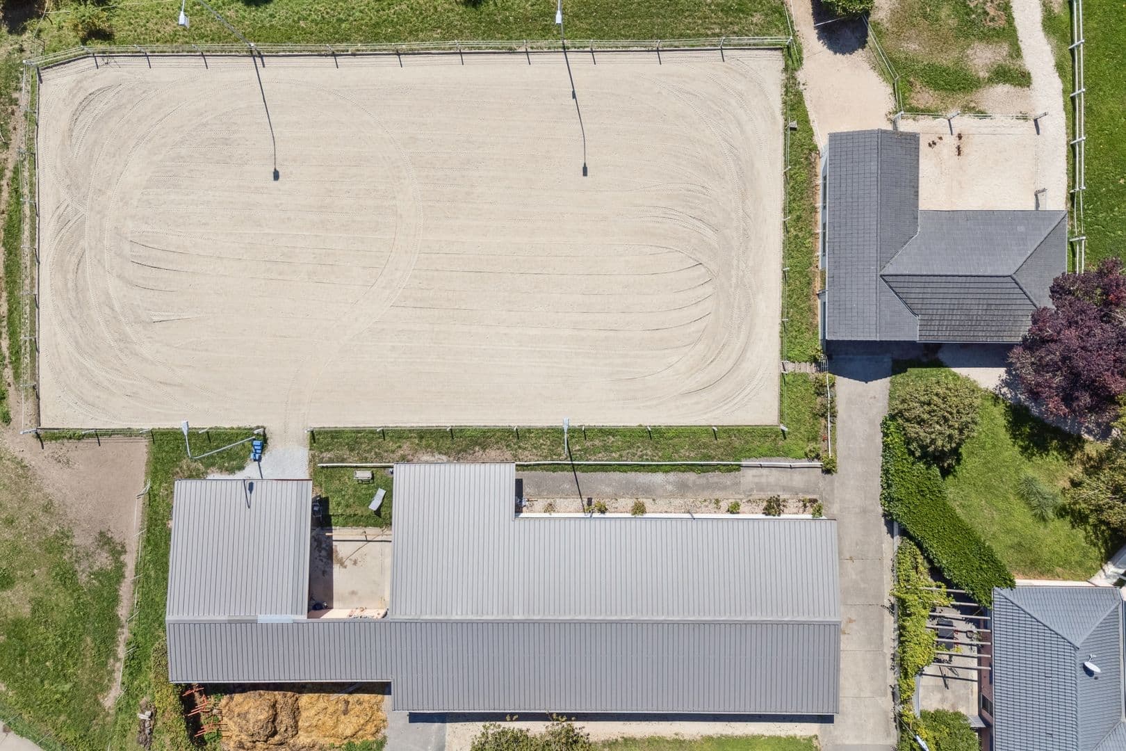 - Sous toiture : tapis roulant, tracteur pour l’entretien des paddocks, zones de déchargement pour foin et paille