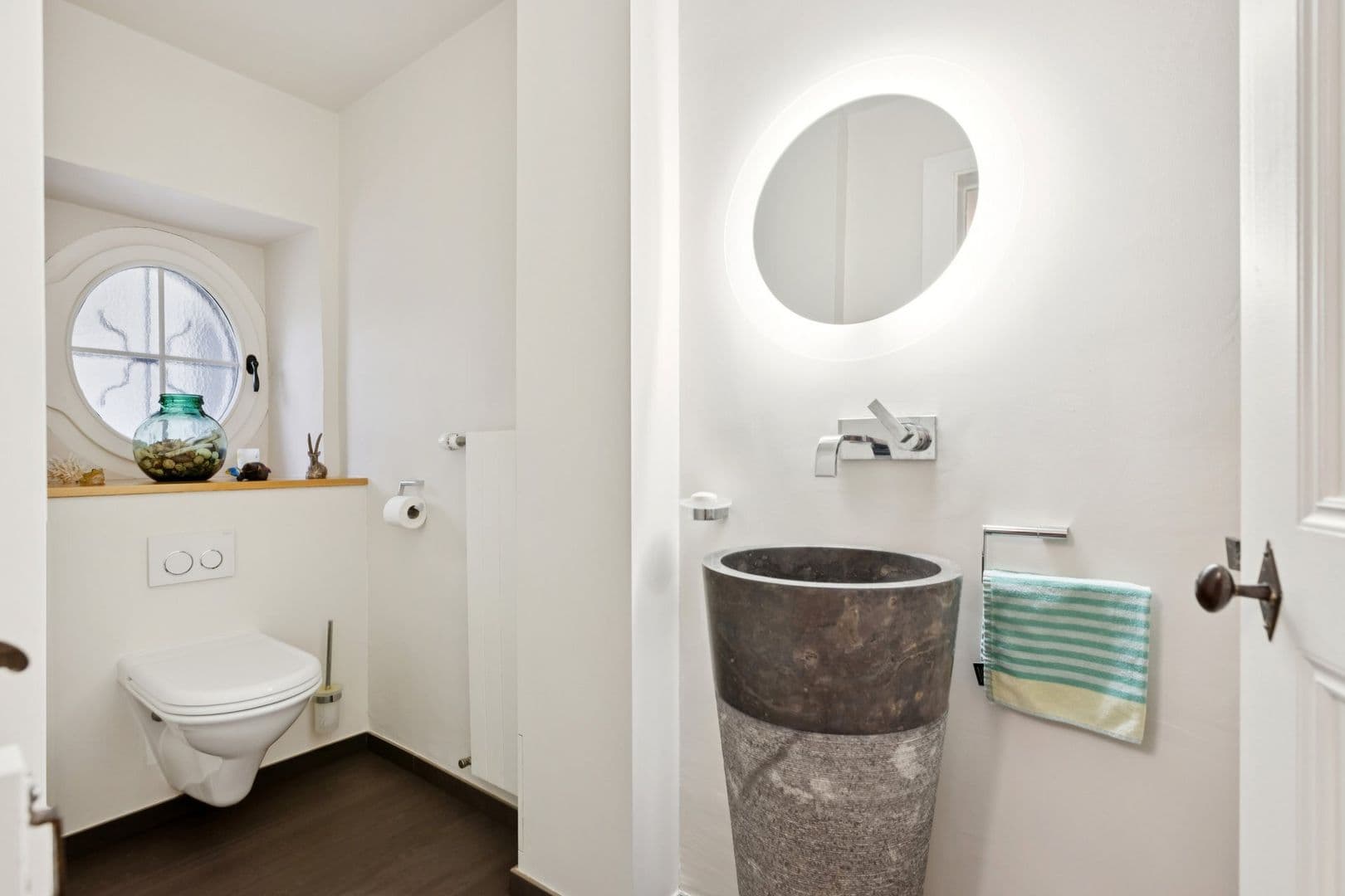 Le rez-de-chaussée comprend une entrée principale avec deux WC visiteurs, un vaste salon et salle à manger avec cheminée, une grande cuisine équipée avec espace repas, une entrée séparée pour le personnel, une cuisine d’été et des terrasses avec coin barbecue.