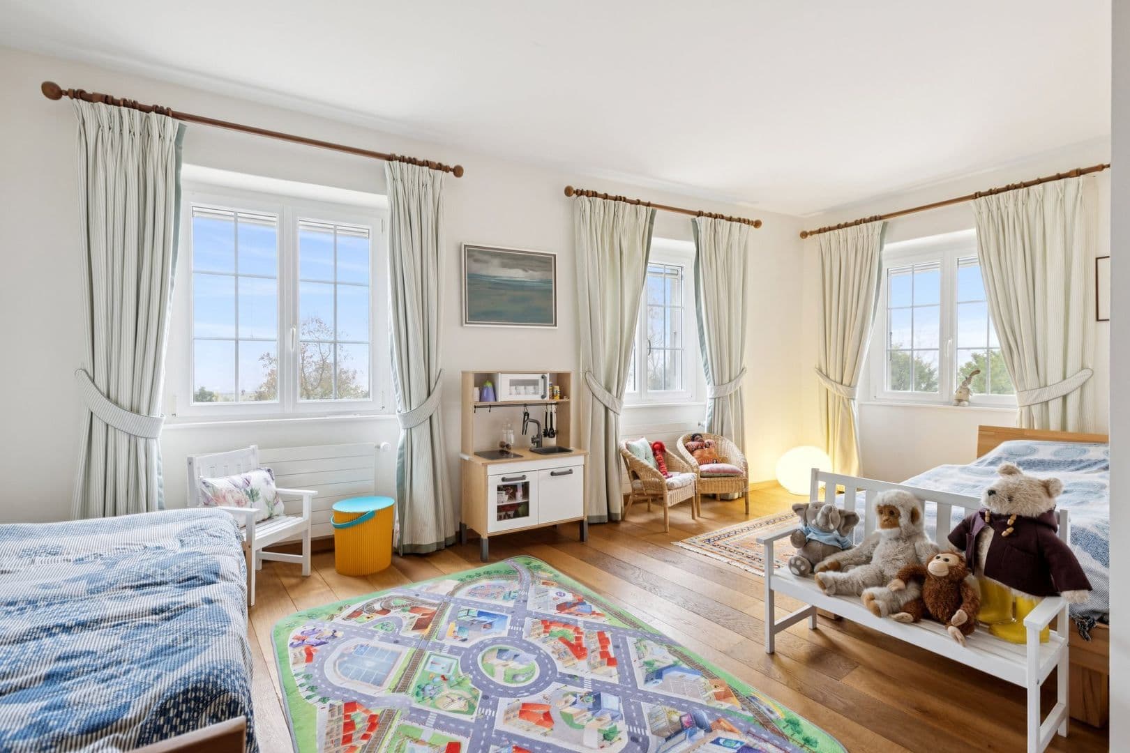 À l’étage, trois chambres dont une suite parentale avec salle de bain, complétées par deux grandes salles de bain supplémentaires, offrent confort et indépendance pour toute la famille. L’attique propose quatre grands espaces polyvalents pouvant servir de chambres, bureaux ou salle de jeux, avec dressing et salle de bain supplémentaire.
