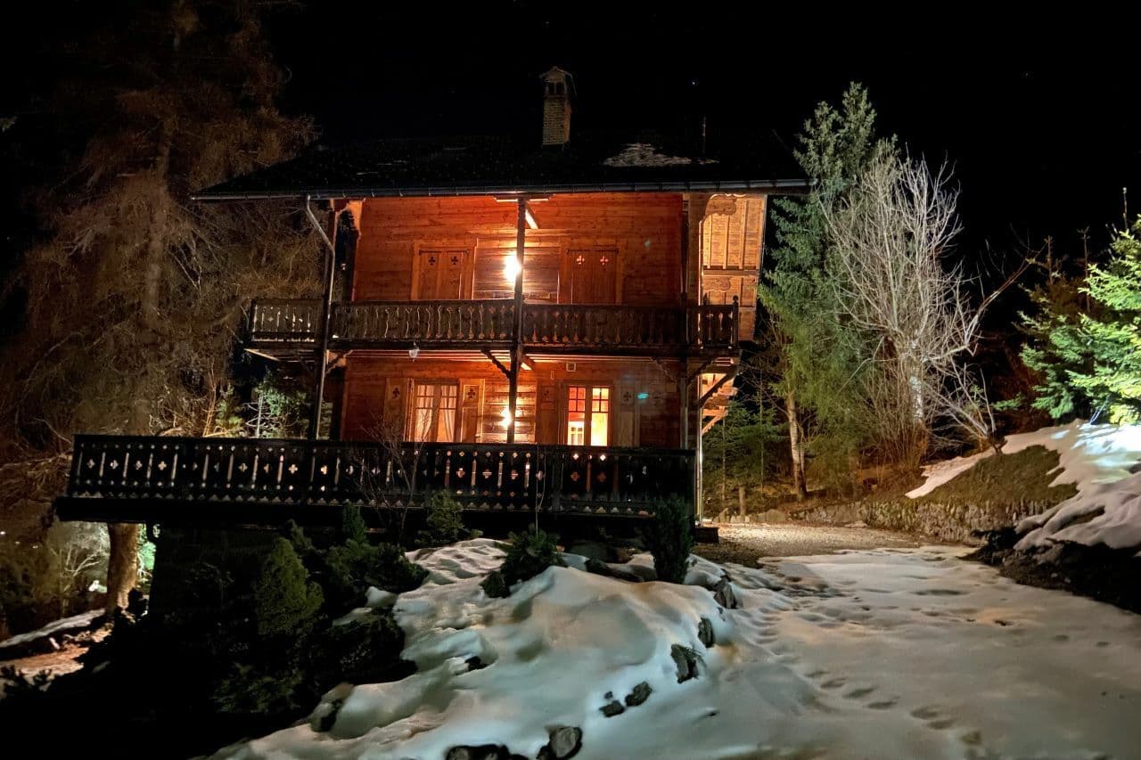 Extérieur : l'accès est aisé toute l'année, une allée en gravier entoure le chalet. La parcelle est magnifiquement arborée avec notamment des pins et un mélèze. Le chalet possède un éclairage extérieur.