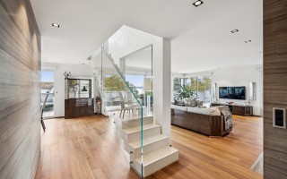Die Wohnung öffnet sich zu einer geräumigen Eingangshalle von mit Einbauschränken, die zusätzlichen Stauraum bietet. Eine schöne offene, voll ausgestattete Küche fügt sich harmonisch in den Wohn- und Essbereich ein, der sich über 48m² erstreckt und Zugang zu einer großen, nach Südosten ausgerichteten Terrasse bietet. Dieser außergewöhnliche Außenbereich ist perfekt, um die schönen Tage zu genießen und dabei die Aussicht zu bewundern.