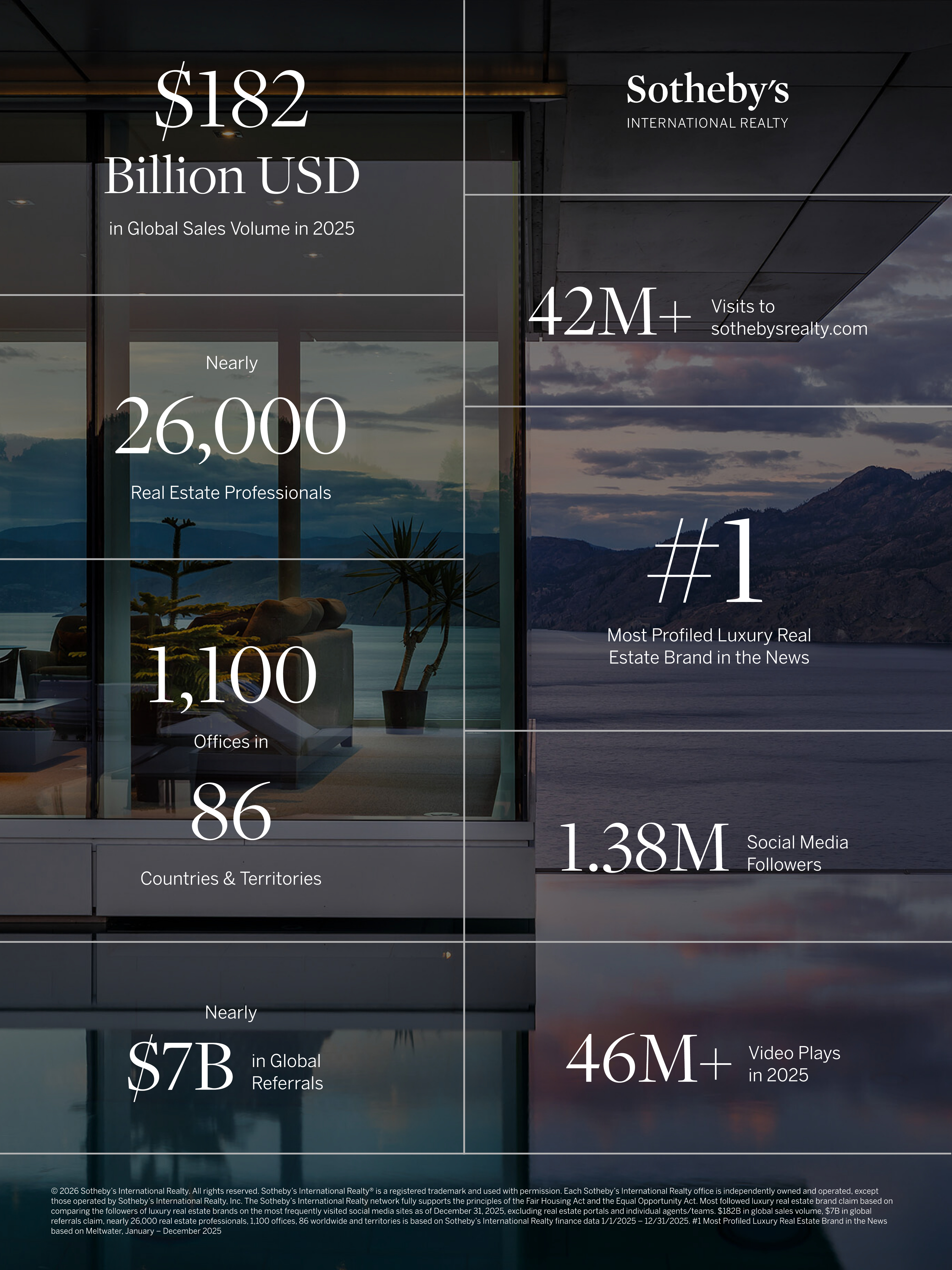 Die Marke Sotheby’s International Realty behauptet weiterhin ihre Spitzenposition auf dem Luxusimmobilienmarkt. Im Jahr 2025 stieg ihr Verkaufsvolumen in den Vereinigten Staaten um 9,3 %, mehr als dreimal so stark wie das durchschnittliche Marktwachstum. Weltweit erzielte die Marke einen Umsatz von 182,4 Milliarden US-Dollar, was einem Wachstum von fast 16 % gegenüber 2024 entspricht.