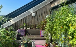The vast balcony elegantly extends the living space and opens up a breathtaking view of the surrounding countryside and mountains in the background - a daily invitation to contemplation.
