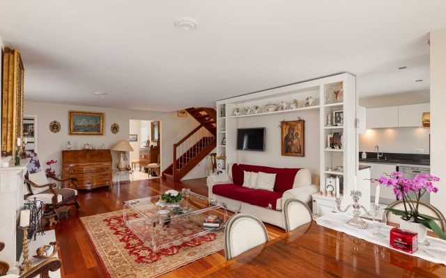 The duplex penthouse comprises 5.5 rooms with 2 bedrooms and a bathroom. On the second floor, a 42m² living/dining area with fireplace, a 13m² semi-open kitchen, a 7m² library, a spacious entrance hall with guest WC and a large 28m² balcony provide a comfortable and warm living environment. The second level houses a 25m² master bedroom with dressing room, a large 22m² bedroom with elevator access, a shower room with sauna and WC, a laundry room and a small separate WC.