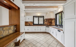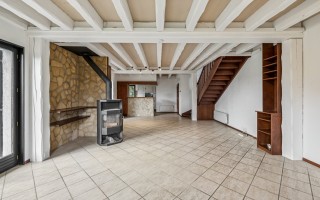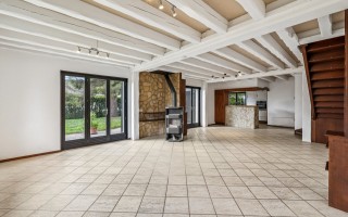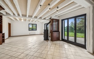 The living room, bathed in light thanks to its south-facing aspect, opens onto the garden and terrace. Exposed beams give the room an authenticity full of character, while the wide openings let nature in, like an extension of the living space.
