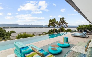 The owner's suite is a haven of peace with a private balcony overlooking the vast grounds: verdant gardens, lighted tennis court, gazebo, cascading pool and spa, pool/guest house with wet bar, infrared sauna, steam room.