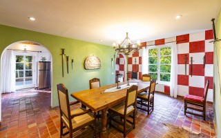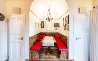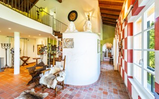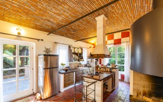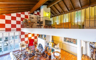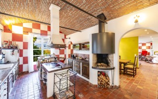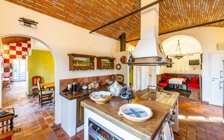 A large entrance hall leads to the living area, consisting of a bright living room with fireplace, a dining room and an eat-in kitchen with fireplace and striking vaulted brick ceiling. Completing the floor is a large panoramic terrace, guest toilet, pantry, storage room, two additional terraces and an internal staircase connecting the various levels.
