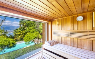 Second lower level (Garden): wellness area with sauna, bath and jacuzzi. In front of it, nestled in a manicured garden, opens a beautiful panoramic swimming pool overlooking the lake.